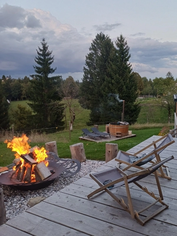Enjoy evenings by the fire pit, relax in the warmth of a private wooden soaking hot tub, and wake up to birdsong and fresh forest air. Here, comfort meets simplicity in a truly natural setting.
